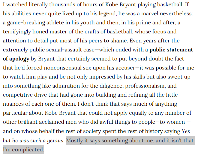 I haven’t considered where that drive to prepare or work hard came from, not for a long while. I absolutely idolized his work ethic growing up, and that passion has been an aspiration I’ve had, even as I realize that I’ve become someone different than I expected when I first learned about him. My feelings about Kobe have only grown more frustrating over time. He is decidedly irredeemable to me because of the rape that he committed, and there is no amount of admiration or inspiration that he can imbue that will eclipse that. I don’t think I can do justice to the words needed to break down this complication of perception, but please read Dave Zirin’s impeccable article, “Wrestling with Kobe Bryant’s Forgotten Apology.” It echoes a lot of that legacy, especially in light of America today. In addition, Albert Burneko’s reflection on Kobe succinctly echoes the internal dichotomy: